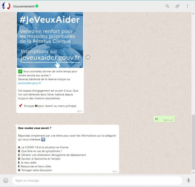 Pour informer les citoyens sur les mesures mises en place afin de lutter contre le coronavirus, le gouvernement français a annoncé le 31 mars la mise en place d’un canal sur WhatsApp. Ainsi, 7 choix sont proposés si vous souhaitez recevoir des renseignements sur la situation en France, connaître les actions à mener en cas de symptômes du Covid-19 ou le dispositif pour devenir bénévole de la réserve civique.