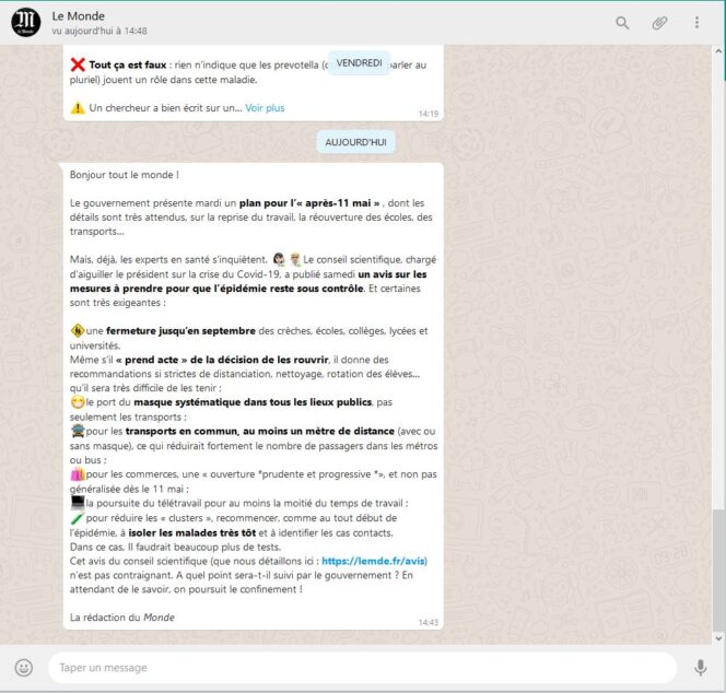 Lancé le 30 mars dernier, en plein confinement, ce fil d’informations gratuites est ouvert à tous. Il suffit de cliquer sur ce lien pour accéder au compte WhatsApp du Monde depuis son smartphone. Pour pouvoir être intégré au sein du groupe, le journal propose de copier-coller ce message dans la nouvelle discussion : « Bonjour, je souhaite accéder au nouveau service WhatsApp du Monde. » Puis, enregistrez le numéro de téléphone associé au compte dans votre répertoire.