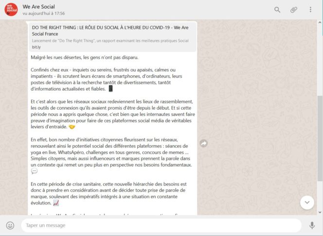 We Are Social est une agence de conseil en communication, qui aide les marques dans leur stratégie sociale et digitale. Pendant la crise du coronavirus, elle a également lancé un fil quotidien d’informations sur WhatsApp « enrichi au fil des jours par nos collaborateurs », précise WAS. Comme Le Monde, vous recevrez un message tous les jours sur une actualité de la sphère des médias sociaux car, même durant la crise, « marques, influenceurs ou simples citoyens redoublent d’ingéniosité et d’imagination, faisant des réseaux sociaux un vaste espace de jeux toujours plus innovant ».