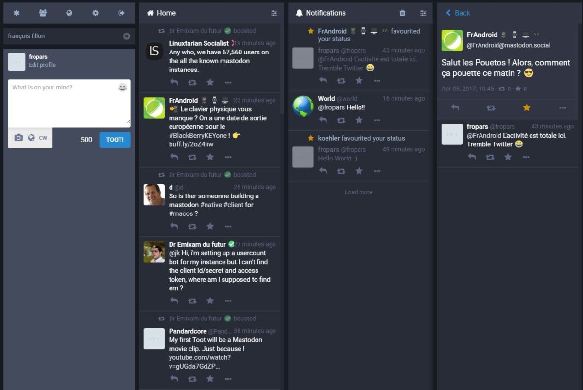 Dans le cas de Mastodon, c’est particulièrement intéressant puisque le réseau cherche à proposer un « nouveau Twitter » tout en gommant les défauts de ce dernier. Concrètement, c’est un service non centralisé (avec plusieurs instances), open-source (qui appartient donc à sa communauté), sans publicité, avec de vrais outils de blocage, sans tracking, avec des API ouvertes, et avec une timeline chronologique. Oui, tout cela est très séduisant. Le design reprend celui de Tweetdeck, avec plusieurs colonnes différentes, et sur desktop Mastodon est bien plus pratique que Twitter. La mascotte du service (un mammouth) rappelle la charte graphique d’Imgur, et là encore, ça ne gâche rien. Pour le reste, Mastodon reprend tous les codes de Twitter : des micro messages (500 caractères), des Timelines, des « Toots » (tweets), des « Boosts » (RT) et des « Favourites ». Si vous utilisez Twitter et Tweetdeck, nous ne serez pas perdus. La volonté d’Eugen Rochko est d’en faire un meilleur Twitter, tant sur la forme que sur le fond : moins de trolls, pas de harcèlement, meilleur contrôle de sa vie privée…