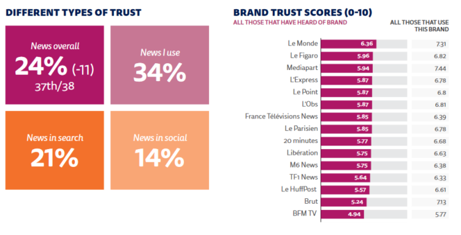 En France, c’est plutôt la défiance envers les médias d’actualité qui pose problème. La confiance envers les médias en France est en effet la plus faible d’Europe (24%) – frappée par la couverture des protestations des gilets jaune. L’indice de confiance de BFMTV, le média d’actualité le plus regardé après TF1, est passée de 5,9 à 4,9 (sur une échelle de dix points) au cours de la dernière année et constitue désormais la marque la moins fiable de la liste. Les médias sociaux sont également pointés du doigt pour avoir favorisé l’expansion des théories du complot, de biais d’opinion et de filtrage algorithmique.