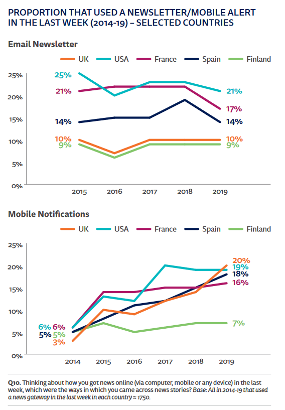 Pour les actualités chaudes, le mobile reste le support le plus plébiscité. Plus précisément, ce sont les notifications qui sont les plus efficaces pour informer les utilisateurs, les newsletters étant en baisse dans plusieurs pays dont la France (17%).