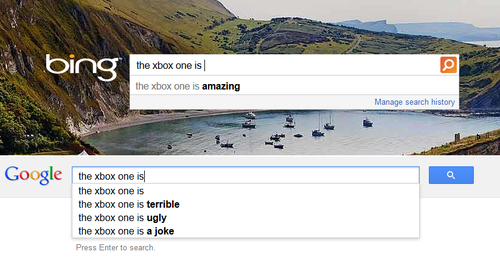 Bizarrement, les suggestions de Bing et de Google ne sont pas toujours les mêmes. Surtout quand on demande l’avis des internautes sur la dernière console de Microsoft… Attention, sujet polémique !