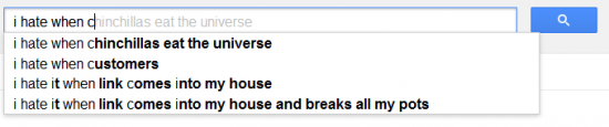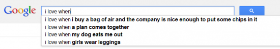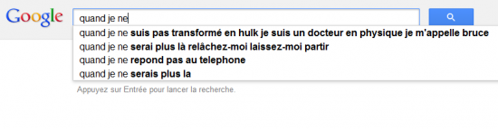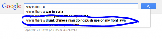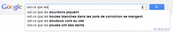 Google n’en reste pas moins qu’un outil, et il peut arriver qu’il déraille (légèrement). Ou que ses utilisateurs détournent quelques-unes de ses fonctionnalités pour s’amuser un peu. C’est le cas, par exemple, avec Google Suggest. Quand vous commencez à entrer quelques mots dans le champs « recherche » du moteur, vous voyez apparaitre des suggestions liées aux requêtes les plus courantes. Des petits malins se sont arrangés pour faire apparaitre des phrases sans aucun sens via cette fonctionnalité. Voici un petit florilège de ce que l’on peut y trouver de plus drôle, en anglais en ou français.