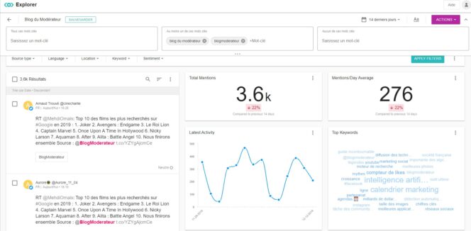 Vous pouvez évidemment filtrer les recherches, par sources (Twitter, Facebook, Blogs, News, YouTube, Instagram…), langage, pays, mots-clés ou sentiment.