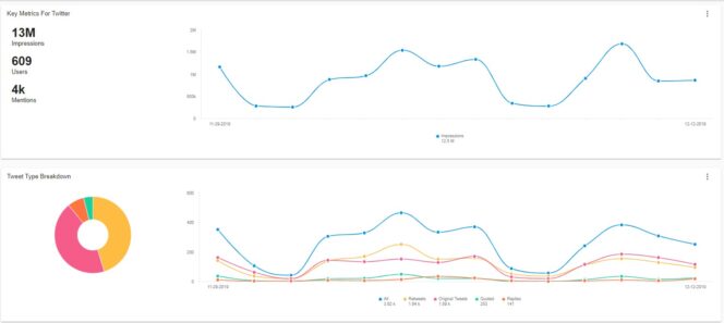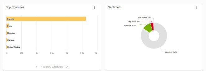 Une fois la recherche configurée, Meltwater génère un dashboard organisé en 3 parties : un espace avec les KPIs principales, un espace dédié aux KPIs social media et un espace dédié aux statistiques Twitter. Parmi les KPIs proposées sur le Dashboard : un flux des différentes mentions, le nombre de mentions, les principaux mots-clés, les pays les plus représentés, et le sentiment des mentions.