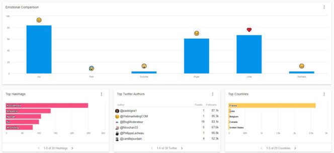 En ce qui concerne les analyses Twitter, vous avez notamment accès au type de contenu posté concernant votre marque ou la marque surveillée (RT, tweets, citations, réponses), aux top emojis, ou aux mots-clés négatifs et positifs les plus utilisés. De quoi avoir une vision complète sur ce qui se dit de vous, ou de vos concurrents. Les analyses Twitter ne nécessitent pas de login, vous pouvez donc surveiller n’importe quel compte, ou n’importe quel mot-clé.