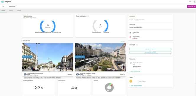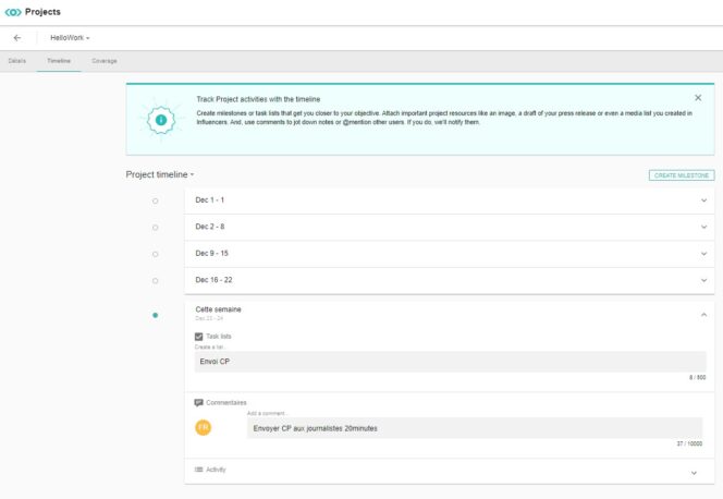 Un onglet Timeline vous permet de gérer l’ensemble du projet et d’y associer les différents membres de l’équipe. Vous pouvez ainsi ajouter des contributeurs au projet, ajouter des ressources (CP, listes de journalistes, PDF…) et créer des listes de tâches (rédiger brouillon du CP, envoyer CP…). Vous pouvez alors avoir une vue d’ensemble sur l’avancement du projet et les tâches de chacun. Enfin, l’onglet « Coverage » vous permet d’avoir la couverture complète des articles les plus impactants.