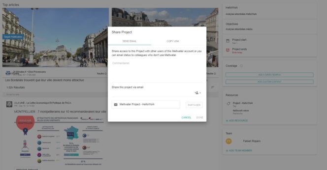 Gros avantage de Meltwater : vous pouvez partager les résultats de vos analyses à n’importe qui via un lien par email. Très pratique pour travailler de façon collaborative ou présenter ses résultats aux équipes. Vous pouvez aussi benchmarker des indicateurs comme nombres de mentions, les impressions ou le sentiment entre plusieurs recherches, ce qui permet d’avoir une vue d’ensemble et concurrentielle d’un sujet.
