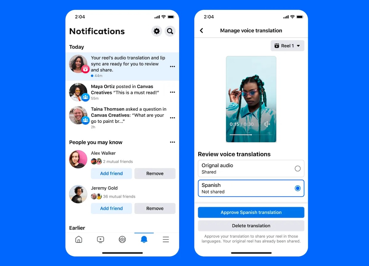 La grande nouveauté se nomme Meta AI Translations. Grâce à cet outil, les créateurs et créatrices de contenu peuvent publier un Reel en anglais ou en espagnol, et le voir automatiquement traduit dans l’autre langue. L’IA conserve le timbre et le ton de la voix d’origine, tentant ainsi de conserver un rendu plus « naturel et authentique ». Une option de synchronisation labiale est également disponible, pour rendre l’expérience encore plus confondante et donner une impression « plus réaliste ».