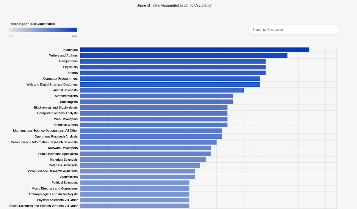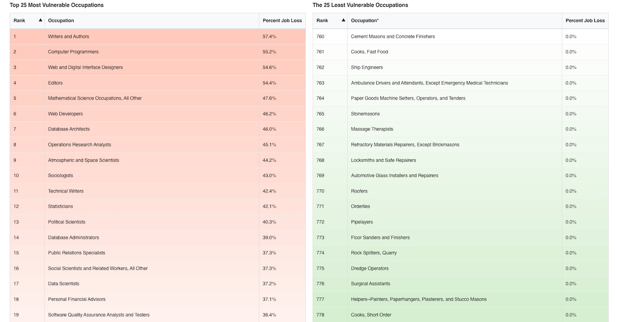 Une étude américaine classe 784 métiers selon leur vulnérabilité réelle à l’IA, avec des projections de pertes d’emploi allant jusqu’à 57 %.