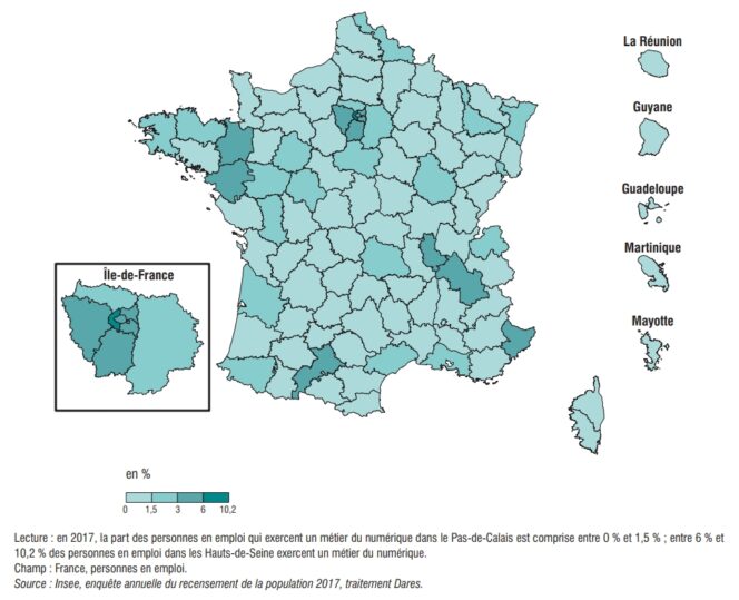 Les emplois du numérique sont très concentrés en région parisienne : « 40 % des postes du numérique se situent dans cette région ». Les métiers du numérique représentent ainsi 5% des emplois en Île-de-France. L’Ille-et-Vilaine et la Loire-Atlantique bénéficient des grandes entreprises de services numériques implantées sur leurs territoires. Les métiers du numériques sont également sur-représentés dans le Rhône, l’Isère, la Haute-Garonne et les Alpes Maritimes du fait de l’attractivité de leurs zones d’emploi (aéronautique à Toulouse, Sophia-Antipolis…).