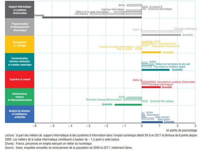 « Ce sont les métiers des programmeurs et des développeurs (14 % de l’emploi du numérique en 2017) qui se sont le plus développés ces dernières années (+ 2 points depuis 2009). Viennent ensuite les métiers de la communication (+ 2 points) : ils représentent désormais 13 % des métiers du numérique en 2017, les métiers de l’animation des sites web, ainsi que ceux de l’élaboration de plans média et du marketing digital, ayant particulièrement augmenté », précise l’étude de la DARES.