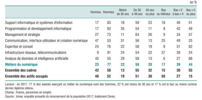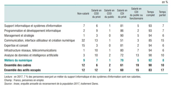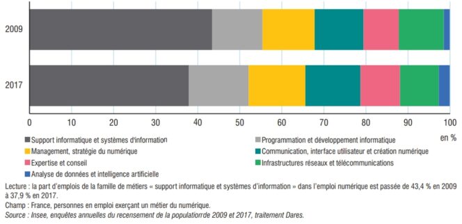 Cette classification permet d’aboutir au chiffre de 800 000 emplois, soit 3% des actifs occupés en France, selon les enquêtes réalisées en 2017. On observe finalement une relative stabilité quantitative : cette part était de 2,7% en 2009. En revanche, on observe des différences et une évolution constante des métiers depuis 10 ans. Ce taux d’emploi numérique n’est que de 2,1% pour les personnes qui exercent leur métier pour le même employeur depuis 10 ans. À l’inverse, 4,1% des actifs occupés qui travaillent pour leur entreprise depuis moins d’un an sont des professionnels du numérique. « L’écart peut s’expliquer par un nombre plus important d’emplois récents ou des mobilités dans ces métiers » selon les auteurs de l’étude de la DARES.