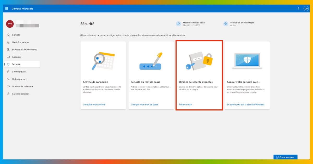 Dans un premier temps, vous devrez vous connecter à votre compte Microsoft avec la méthode classique, puis vous rendre sur la page d’accueil dudit compte. Suivez ensuite ces étapes (voir images ci-dessous et en une) :