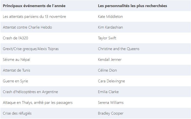 Décembre vient à peine de débuter, et déjà les récapitulatifs commencent à être publiés par toutes les plateformes et acteurs du contenu. Après Instagram hier, c’est au tour de Microsoft de dévoiler les recherches les plus populaires de 2015 sur son moteur de recherche Bing. Sport, sciences, personnalités, évènements… Tout ce qui a fait l’année, en positif ou négatif, est présent dans ce zeitgest. Les tragiques évènements de janvier et de novembre sont évidemment en haut de liste, tout comme Kate Middleton, Louane, la coupe du monde de rugby ou la charcuterie qui serait cancérigène. Voici donc le classement complet par rubrique, pas de grosses surprises pour les thèmes abordés en France !