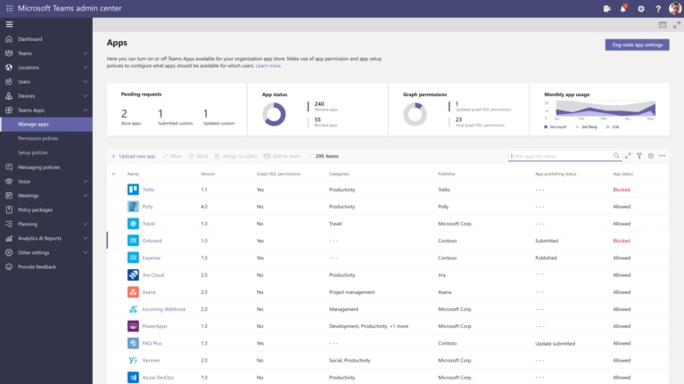 Il sera ainsi possible de soumettre une application dans Teams via l’une des autres plateformes de Microsoft (App Studio, Visual Studio, Visual Studio Code, Power Apps, SharePoint Framework). D’autres fonctionnalités de gestion des apps dans le centre d’administration de Teams sont proposées :