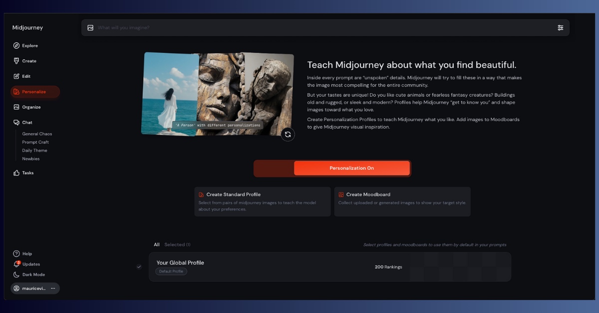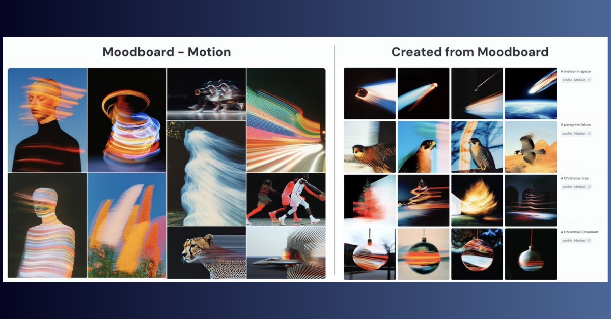 Jusqu’alors, pour personnaliser un profil, vous deviez choisir votre image préférée entre deux proposées, et répéter cette opération pour 200 paires d’images. Désormais, avec les Moodboards, les utilisatrices et utilisateurs peuvent transmettre « une collection d’images » (jusqu’à 30 visuels) qui les inspire, « pour créer une ambiance ou une atmosphère particulière ». Une fois le profil de personnalisation créé grâce à votre Moodboard, un code vous sera transmis, correspondant au modèle personnalisé, à utiliser lors de vos générations pour appliquer la touche spécifique voulue.