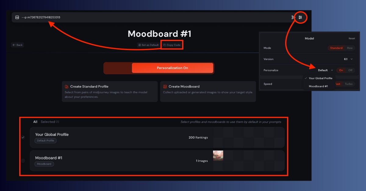 Sur la page de votre Moodboard, sous son nom, deux boutons sont disponibles : le premier, Set as Default, vous permet de faire de ce modèle personnalisé votre modèle par défaut, activé à chaque nouvelle génération ; le second, Copy Code, vous transmet un accès rapide au code de votre modèle (commençant par la commande –-p), celui-ci étant automatiquement collé dans la barre de prompting.