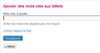Retournez ensuite sur la rubrique « Billets« . Cliquez sur « Filtre » puis sélectionnez une catégorie. Sélectionnez tous les billets qui apparaissent. Attention, il peut y avoir plusieurs pages, si c’est le cas changez juste le nombre de billets par pages dans les filtres pour qu’ils apparaissent tous. Cliquez ensuite en bas à droite sur « Action sur les billets sélectionnés » puis sur « Ajouter des mots-clés« . Entrez le nom de la catégorie concernée, qui sera alors transformée en tag. Tout est désormais prêt pour l’import.