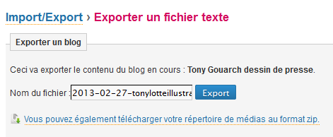 Il vous reste une dernière chose à faire sur votre admin : exporter votre fichier texte. Pour cela, rendez-vous dans « Extensions > Import/export« . Cliquez sur « Exporter le fichier texte » puis sur « Export« . Vous aurez alors téléchargé le fichier.