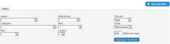 Il y a quelques différences entre Dotclear et Overblog, vous devrez donc préparer votre blog à la migration. L’étape la plus importante va concerner vos catégories. En effet, lors de l’import, Overblog ne conserve que les tags. Il va donc vous falloir changer vos catégories en tags pour conserver votre blog à l’identique. Commencez par supprimer vos tags existants, qui ne vous serviront plus. Pour cela, allez dans la rubrique « Billets». Sélectionnez l’intégralité de vos billets en changeant le nombre de billets par page dans les « Filtres». Choisissez le nombre d’article que vous avez écrit pour avoir tout sur la même page.