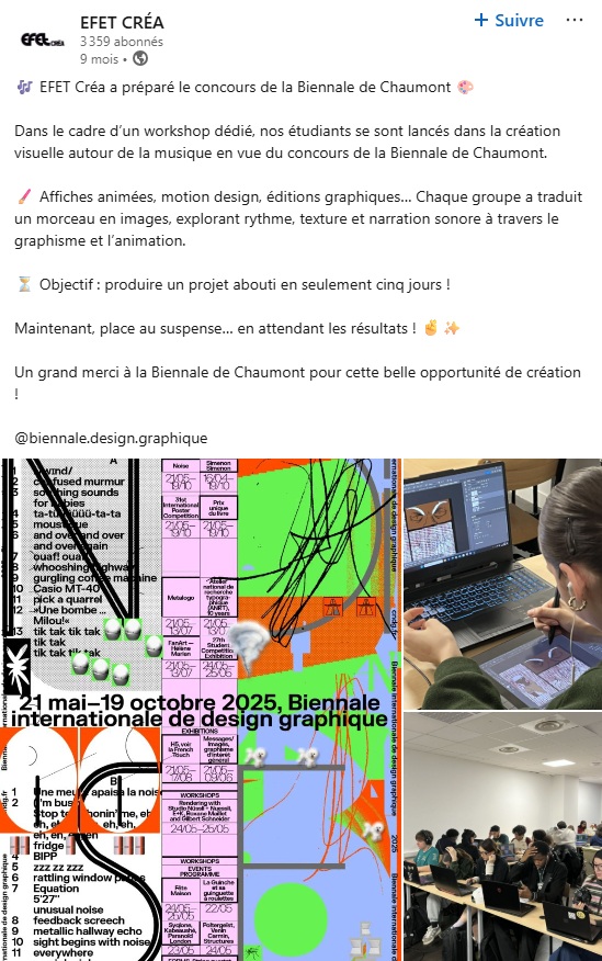 Parmi les autres concours professionnels, on retrouve aussi le Club des Directeurs Artistiques pour lequel 2 projets étudiants ont été shortlistés dans le cadre de cette autre compétition qui regroupe les acteurs de la publicité. « On a travaillé sur un brief pour l’association Les Déterminés. Sur 80 étudiants participants, seuls six sont arrivés en finale, dont deux des nôtres. L’efficacité de notre approche pédagogique a été un levier essentiel pour répondre de manière pertinente à ces problématiques. » Autre succès lors de la Biennale de Chaumont autour de la création visuelle, avec la transcription en images d’un morceau de musique.