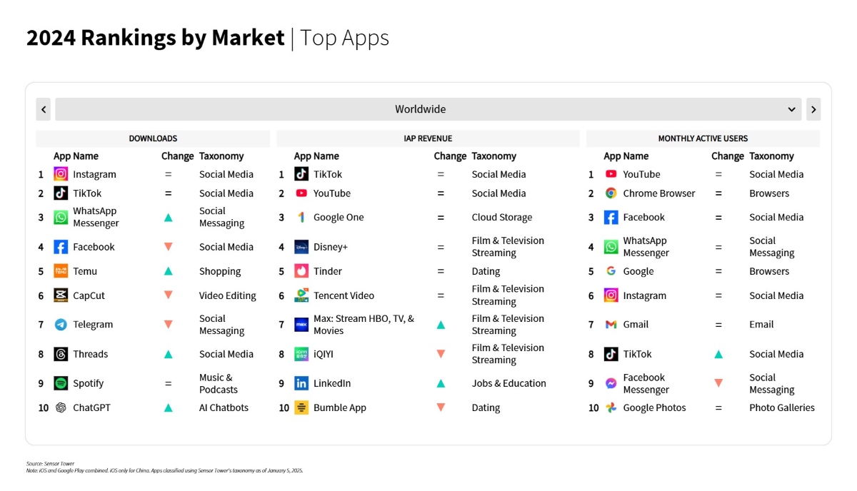 Voici les 10 applications les plus téléchargées dans le monde en 2024 (voir image de une) :