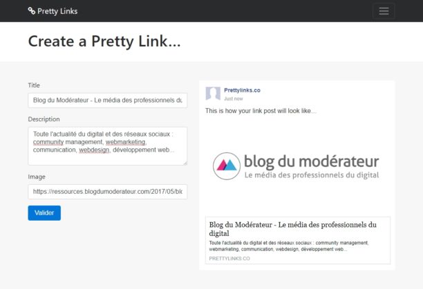 Pour utiliser Pretty Links, pas besoin de vous inscrire : vous n’avez qu’à copier coller le lien que vous souhaitez partager sur Facebook. L’outil récupère alors les données Open Graph du code source de la page web, comme le montre le screenshot ci-dessus. Comme vous le voyez, vous pouvez modifier le titre affiché, la description ainsi que l’URL de l’image. Ensuite, cliquez sur « Valider » : vous obtenez un lien raccourci (prettylinks.co) qu’il suffit de partager sur Facebook.