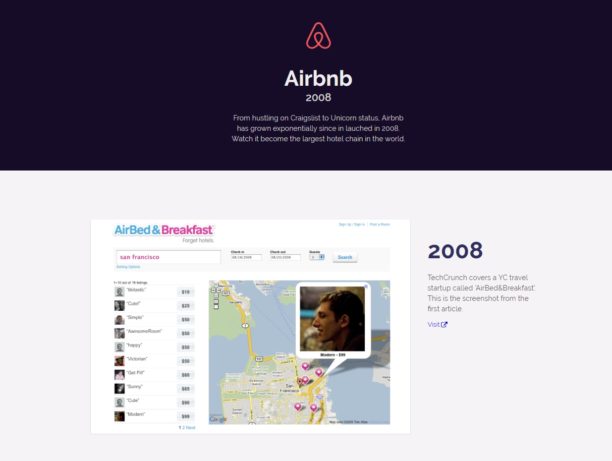 Le site se penche notamment sur Google, Amazon, Pinterest, Facebook, YouTube, Reddit, AirBnb, Twitter, Yelp, Yahoo ou encore le New York Times. Pour chaque site examiné, vous aurez un aperçu du design à son lancement, ainsi qu’une courte analyse de chaque évolution importante. On se rend compte du chemin parcouru en peu de temps par certains sites tels que AirBnb. Ce dernier lancé en 2008 n’a en effet plus rien à voir aujourd’hui…