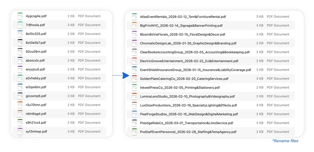- Renommage en masse de fichiers selon un format standard, sur des centaines d’éléments en quelques minutes,