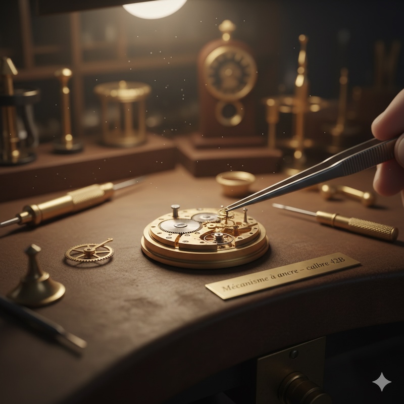- Un atelier d’horlogerie ultra-détaillé photographié en macro, objectif 100 mm, ouverture f/2.8, ratio 3:2, éclairage latéral révélant la texture du métal, avec une plaque intégrée portant le texte « Mécanisme à ancre – calibre 42B ».