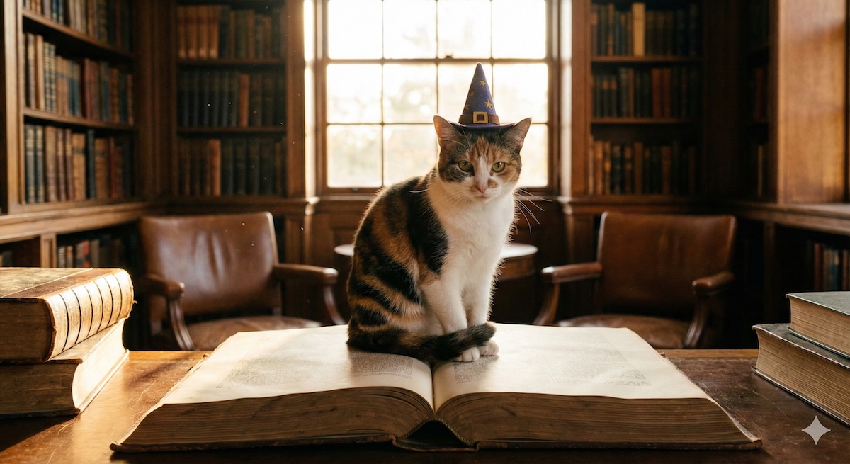 - Un chat calico portant un petit chapeau de magicien, assis sur un vieux livre ouvert dans une bibliothèque ancienne, lumière chaude de fin d’après-midi et rendu photographique avec une légère profondeur de champ.