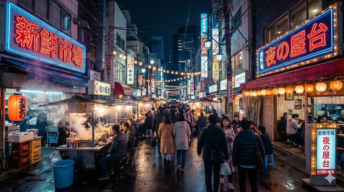 - Une scène en extérieur capturée en ultra-grand-angle 14 mm, ratio 16:9, représentant un marché nocturne asiatique avec des enseignes lumineuses affichant du texte en japonais (« 新鮮市場 », « 夜の屋台 »), profondeur de champ étendue et éclairages colorés dominants.