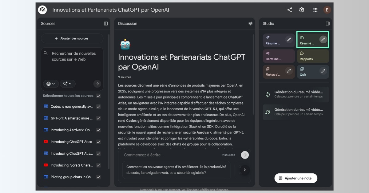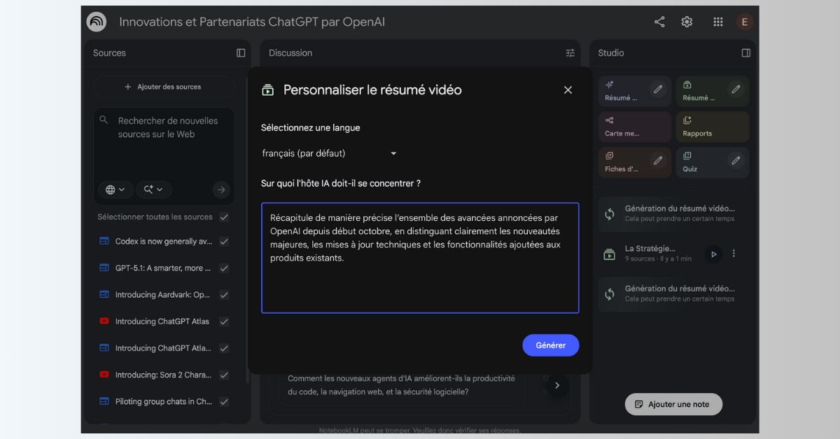 Une fois les sources ajoutées, il suffit de cliquer sur l’icône en forme de crayon dans la carte Résumé vidéo, accessible dans l’interface Studio à droite de l’écran, puis de saisir une requête afin de définir la trame de la vidéo et d’orienter le propos de l’hôte généré par IA. Pour cet exemple, nous utilisons la requête suivante : « Récapitule de manière précise l’ensemble des avancées annoncées par OpenAI depuis début octobre, en distinguant clairement les nouveautés majeures, les mises à jour techniques et les fonctionnalités ajoutées aux produits existants. »