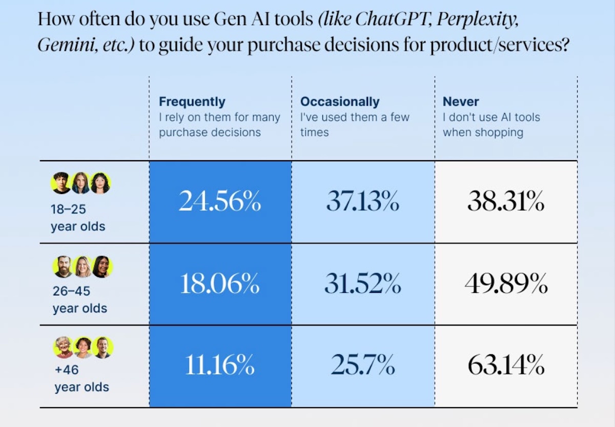 Près de deux jeunes sur trois âgés de 18 à 25 ans (62 %) utilisent ces outils pour guider leurs choix, tout comme la moitié des 26-45 ans. En revanche, seuls 37 % des plus de 46 ans y ont recours, constate l’étude (voir image de une). Cette tendance influence aussi la manière dont les marques assurent leur visibilité. Le SEO traditionnel évolue vers le GEO (Generative Engine Optimization), où les moteurs génératifs privilégient les contenus authentiques et crédibles.