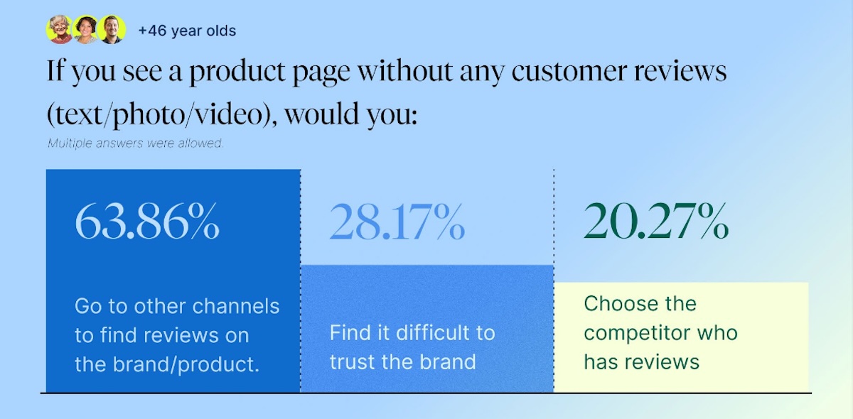 Alors que nous sommes saturés d’informations, nous recherchons de plus en plus des preuves tangibles avant de nous engager. Les avis clients publiés sur les pages produits s’imposent comme la source de confiance la plus importante, tous âges confondus. Leur absence reste un signal d’alerte : 54 % des répondants iraient chercher des avis ailleurs et 53 % estiment que cela réduirait leur confiance envers la marque. Un tiers se tournerait directement vers un concurrent qui en propose.