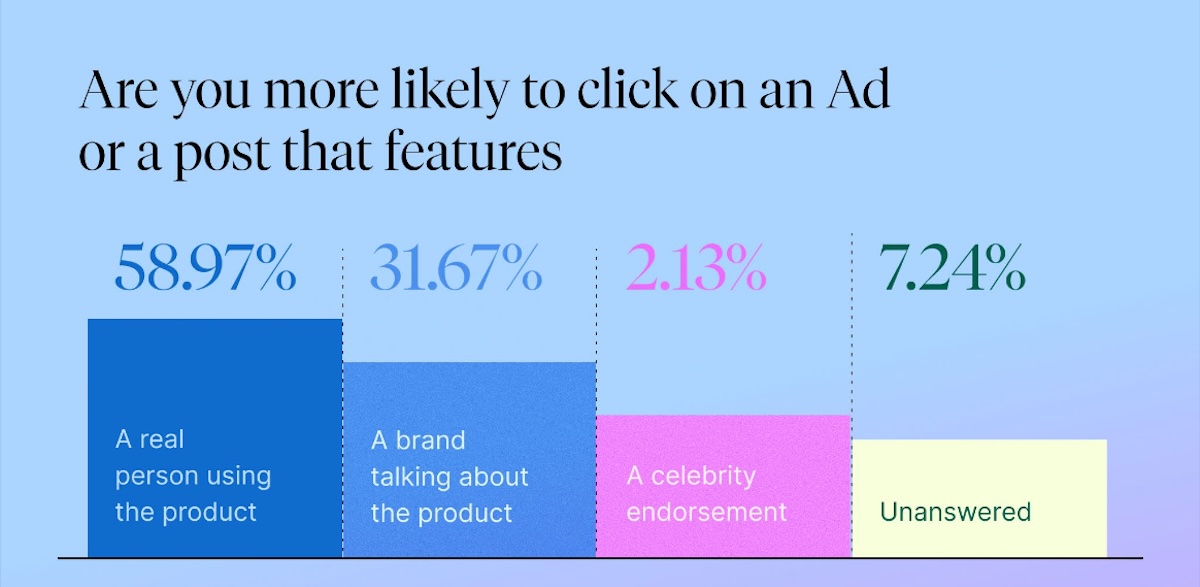 L’étude souligne cependant le poids de l’UGC dans ce modèle. Près de six répondants sur dix (59 %) cliquent davantage sur des publicités qui mettent en scène de véritables utilisateurs et utilisatrices, contre seulement 2 % pour celles centrées sur des célébrités. Aux États-Unis, cette proportion monte à 67 %. L’Italie se distingue par un profil plus équilibré : 45 % des consommateurs y accordent autant d’importance aux contenus de marque qu’aux contenus UGC.