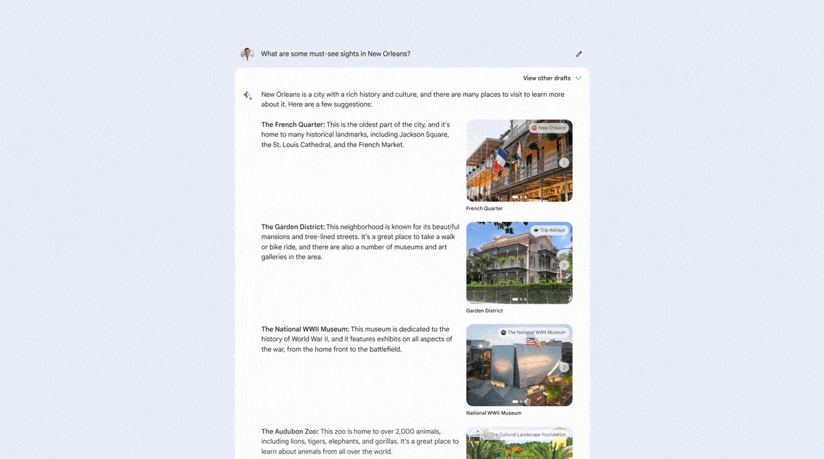 Vous pourrez lui poser des questions telles que « Quels sont les sites incontournables de la Nouvelle-Orléans ? » – et vous obtiendrez une réponse utile ainsi que des images riches qui vous donneront une bien meilleure idée de ce que vous êtes en train d’explorer.
