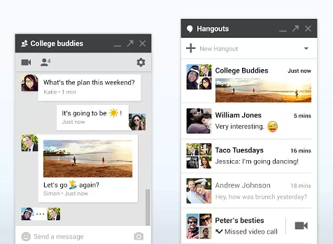 Auparavant, Google Talk permettait de discuter sur Gmail. Cette fonctionnalité était également présente sur Google Plus. Désormais, on parlera de Google Hangouts pour désigner l’outil de conversation unifié. Sur Google+, la fonctionnalité dédiée à la conversation est toujours présente au sein d’une colonne latérale présente à droite et rien n’a changé sur Gmail. Hangouts permet d’envoyer des messages, partager des photos ou effectuer des appels vidéos, avec un ou plusieurs amis. Une extension pour Google Chrome est également disponible, pour accéder rapidement aux conversations. À noter que celle-ci peu rester active lorsque vous fermez votre navigateur.