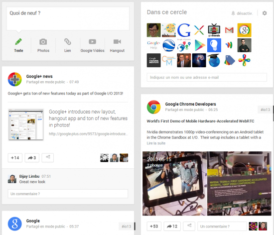 Au niveau du flux d’accueil et du profil, terminé la colonne unique : vous verrez désormais défiler les publications sur plusieurs colonnes, selon votre résolution. Une bonne façon de remplir l’espace, pas tout à fait optimisé avant la refonte. La fenêtre de publication a également été revue, mais les fonctionnalités sont similaires. Le flux d’accueil ne se rafraîchit plus automatiquement, mais Google+ vous indique lorsqu’un ou plusieurs nouveaux posts ont été publiés depuis le dernier rafraîchissement. Enfin, les hashtags sont désormais intégrés à côté de chaque post.