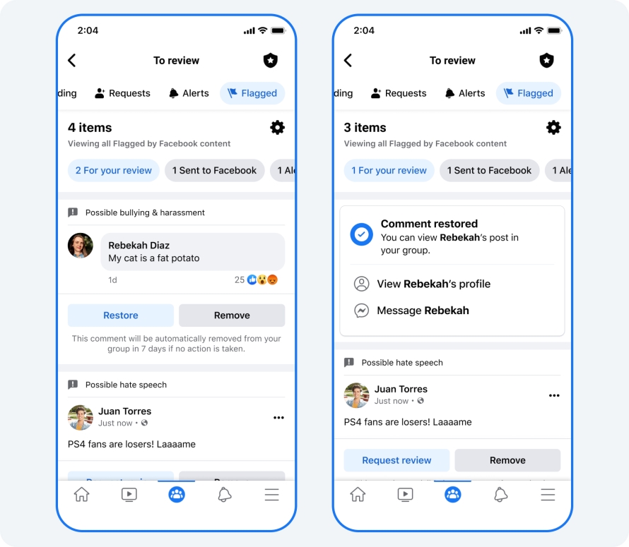 Enfin, Facebook va permettre à certains groupes d’adapter la modération des contenus en fonction du contexte. Dans l’exemple ci-dessous, on voit un utilisateur « comparer son chat à une grosse patate » : l’administrateur peut considérer que ce n’est pas du harcèlement, alors dans un autre contexte, cette expression aurait pu être considérée comme telle.