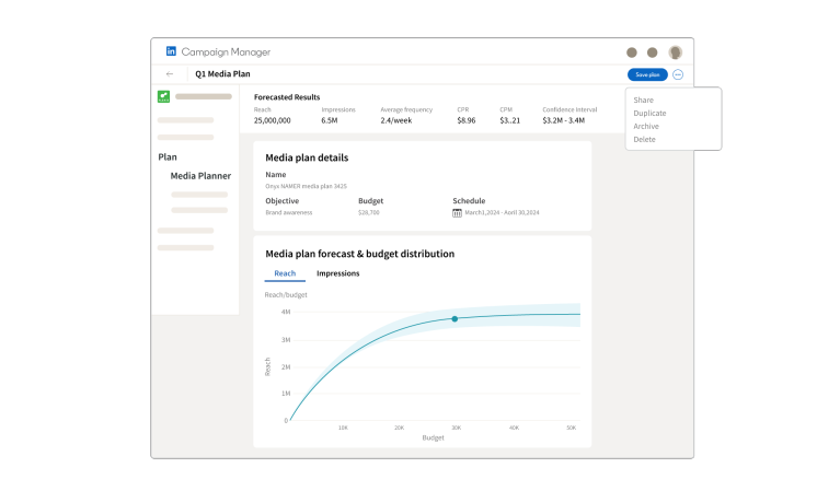 Pour optimiser les stratégies de campagnes et maximiser « l’efficacité des dépenses publicitaires », LinkedIn introduit Media Planner. En pratique, il s’agit d’un module permettant d’évaluer le potentiel d’une campagne publicitaire avant son lancement. Il offre la possibilité d’évaluer différentes options de ciblage, de placement ou de budget pour « estimer la portée, les impressions (…) ou le coût par résultat selon vos objectifs », complète Martha Pavoni, group product manager chez LinkedIn. La plateforme permet également de sauvegarder et de partager ces plans médias.