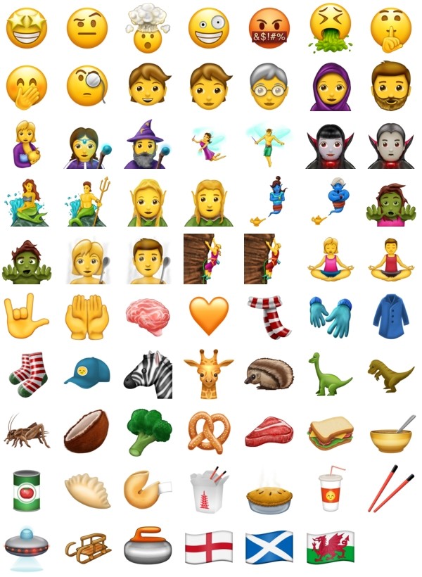 Parmi les nouveaux emojis : un homme avec une barbe, une femme avec un voile, des personnages fictifs (génie, fée, magicien, troll…), des emojis pour représenter des activités comme le yoga ou l’escalade, de nouveaux vêtements (écharpe, gants, chaussettes de Noël…), des animaux comme le hérisson, la girafe et quelques dinosaures, de nouveaux aliments comme le steak ou le brocoli, les drapeaux de l’Angleterre, l’Écosse et le Pays de Galles, un nouveau cœur orange, un emoji ovni…