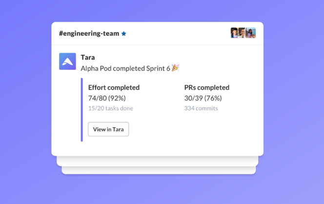 Tara AI est fait pour le travail de groupe, en partageant des documents, des tâches et des indicateurs pour avoir une vision unifiée des sprints et des projets en cours. Apporter les informations qui vous concernent sur un espace comme Slack, souvent essentiel dans les interactions quotidiennes avec les membres de l’équipe, est un réel avantage en termes de temps et de simplicité. L’application vous propose de recevoir des notifications dans plusieurs cas de figure : quand on vous mentionne, quand de nouvelles tâches vous sont attribuées ou que vos tâches sont commentées, ou encore quand un sprint se termine. Une fois votre équipe connectée à GitHub ou GitLab, chaque membre recevra un rapport de performance sur Slack à la fin de chaque sprint, comprenant notamment l’effort réalisé, les tâches ou encore le nombre de commits.
