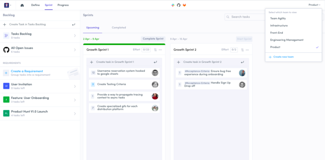 Tara a procédé à un rafraichissement de son interface, et en a profité pour proposer un nouvel arbre de navigation. 6 sections principales sont désormais accessibles, vous permettant une navigation plus intuitive entre les demandes qui vous sont envoyées, vos différentes équipes ou la gestion de vos sprints. L’envoi d’invitations à de nouveaux utilisateurs a également été facilitée.