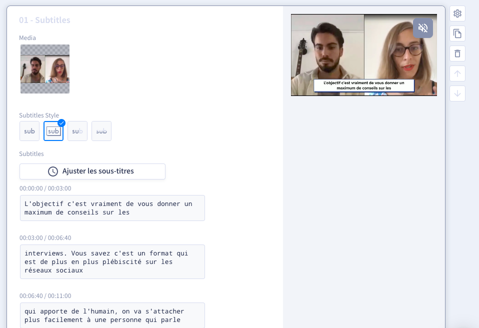 Habituellement, cette mission peut être un vrai casse-tête. Avec PlayPlay, c’est simple comme bonjour ! Particulièrement grâce au sous-titrage automatique : en un clic, l’outil génère automatiquement vos sous-titres en quelques secondes dans la langue de votre choix.Vous pourrez ensuite éditer le texte simplement et ajuster très précisément le timing d’apparition.