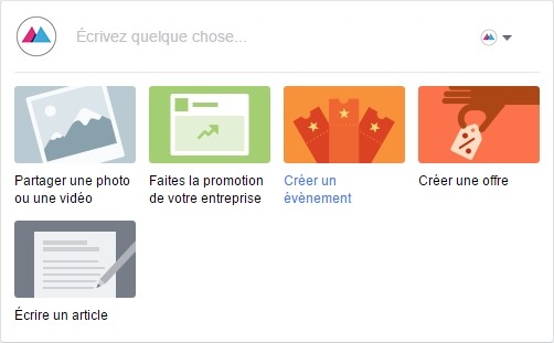 Facebook indique qu’il s’agit de « nouvelles options de publication [qui] vous aideront à communiquer avec vos clients et obtenir les résultats que vous souhaitez ». En réalité, il s’agit d’une réorganisation d’options déjà disponibles ailleurs. Vous pouvez désormais publier plus facilement des photos ou des vidéos, faire la promotion de votre entreprise (comprenez : achetez de la publicité), créer un événement, une offre ou un article. Certains community managers ont accès à davantage d’options, telles que :