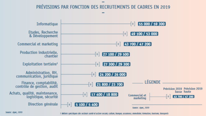 Plus précisément, l’informatique et la R&D sont les activités qui devraient recruter le plus en 2019. Associées aux fonctions commerciales et marketing, elles présenteraient à elles seules 6 embauches sur 10 en 2019. L’informatique pourrait par exemple observer une croissance entre 10% et 19% dans les recrutements. Pour sa part, le secteur de la R&D connaîtrait une hausse entre +4 % et +12 % pour cette année. Du côté de la fonction commercial-marketing représenterait 17 % des recrutements de cadres.