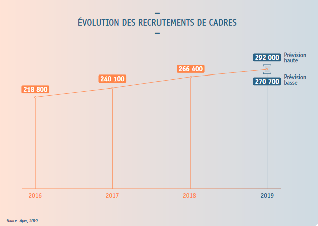 En 2018, l’embauche des cadres en France a augmenté de 11%. Les entreprises ont en effet recruté 266 400 cadres, et ce chiffre pourrait passer entre 270 700 et 292 000 en 2019, soit une progression située entre 2 et 10%.